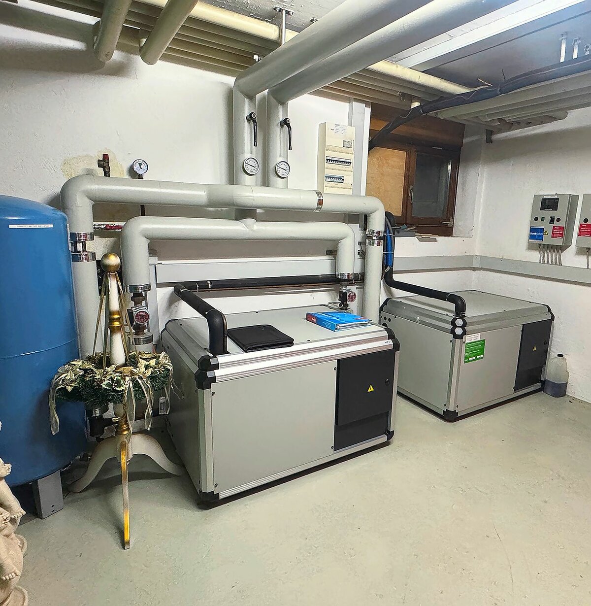 Neue Heizungslösung: Zwei aussen aufgestellte, kaskadierte Luft-Wasser-Wärmepumpen Elco Aerotop SPK20 (Leistung je 20 Kilowatt) für Raumwärme. Warmwasseraufbereitung via Wärmepumpe (Hauptgebäude) respektive Solarthermie-Anlage (Nebengebäude). Pufferspeicher (Volumen 800 Liter) sowie Warmwasserspeicher (Volumen 500 Liter) im Hauptgebäude. Separater Warmwasserspeicher in Verbindung mit Solarthermieanlage im Nebengebäude. Fernwartung Remocon Net für Diagnose und Steuerung via App.