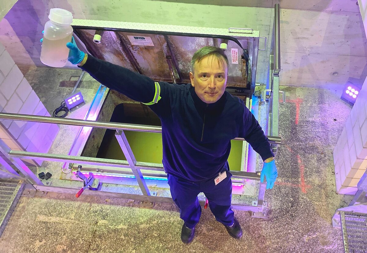 Wie sauber das Wasser inzwischen ist, zeigt der Rundgangleiter mit einer Probe. In der Plastikflasche schwimmen noch Kleinststoffe aus Fäkalien, Essensresten oder Papierfetzen. Nachdem das Öl aus dem Abwasser entfernt wurde, fliesst es im nächsten Schritt in vier runde Vorklärbecken mit einem Durchmesser von 46 beziehungsweise 48 Metern. Der Klärschlamm wird hier bei einer ruhigen Strömung am Boden abgesetzt, um anschliessend abgesaugt zu werden. Zur Belustigung der Besuchenden sitzen ein paar Möwen auf der ruhigen Wasseroberfläche und demonstrieren die Gemütlichkeit der Becken.