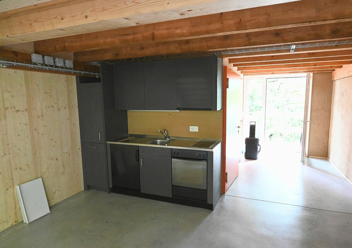 An neue Gegebenheiten muss sich auch das Auge gewöhnen. So werden zum Beispiel in den Ateliers die Stromkabel über Putz in Rohren oder Traversen geführt. Auch die Steckdosen und Schalter sind über Putz montiert. «Wenn jemand in drei Jahren mehr Strom oder einen neuen Router braucht, können diese Kabel einfach in die Traverse gelegt werden. Man muss weder die Wand aufspitzen noch unzählige Kabelkanäle montieren», sagt This Alder. Und natürlich können auch diese kleinen Bauteile nach dem Rückbau ein zweites Mal genutzt werden. Konsequent durchgezogen ist der Kreislaufgedanke auch bei den Küchen und Nasszellen. Ob Fliesen, Küchengeräte, Fronten, Abdeckungen oder Duschstangen – praktisch alles Material ist entweder eine Occasion oder stammt aus «falschen» Chargen.