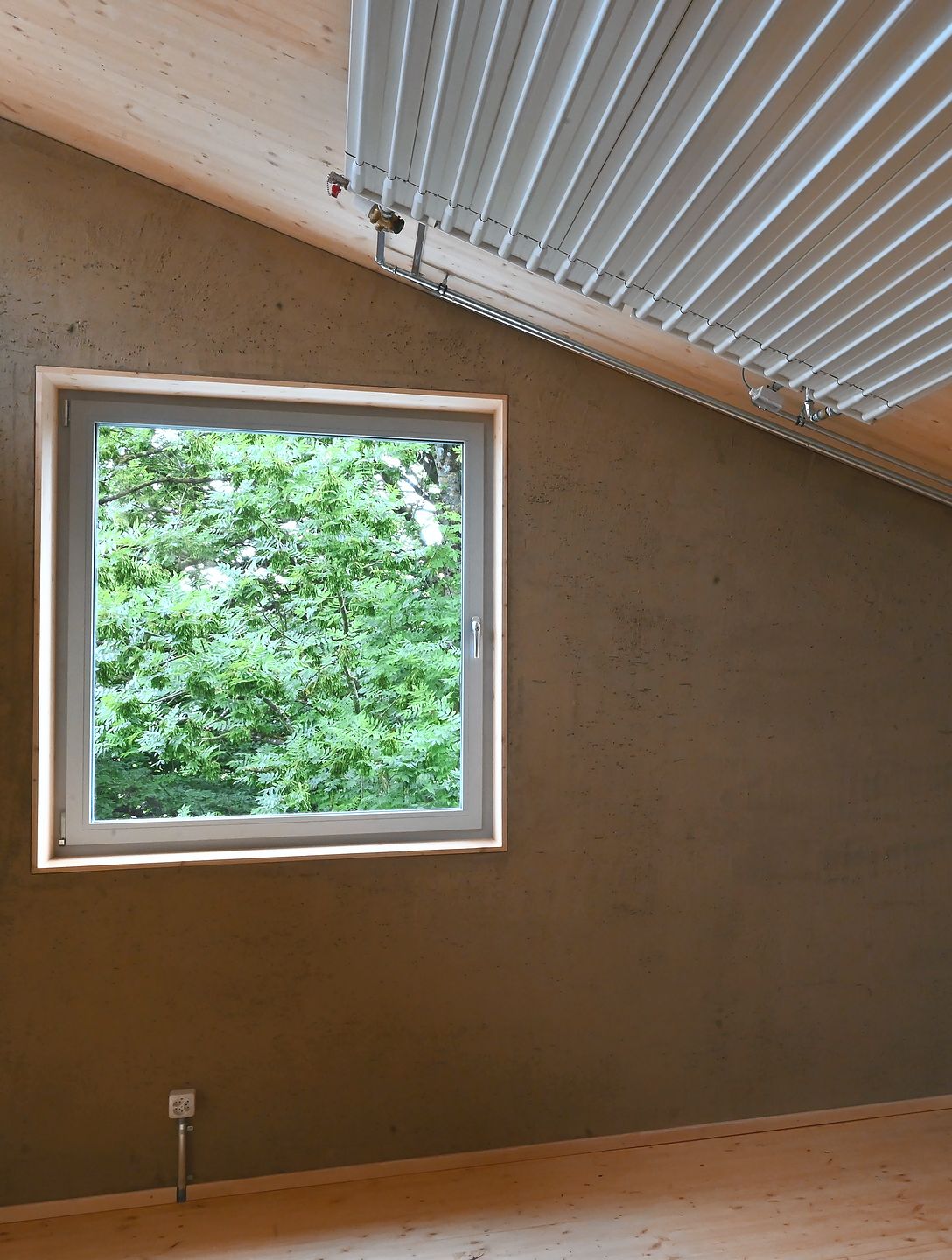 Wer von der Uetlibergstrasse in die Grubenstrasse einbiegt, die bis zum westlichen Rand der alten Lehmgrube führt, sieht deshalb nicht nur Neubauten, sondern auch ältere, windschiefe Schuppen und kleinmassstäbliche Fabrikgebäude. Das Gebäude mit der Nummer 29 ist gut 90-jährig. Über der bewitterten Fassade erhebt sich eine neue Aufstockung, die mit himmelblauem Stahlblech verkleidet ist. Dahinter verbirgt sich eine raffinierte, zweigeschossige Holzständerkonstruktion. Diese wurde mit Strohballen gedämmt und mit Lehm verputzt. Für diese Materialisierung gebe es zwei gute Gründe, sagt This Alder, zuständiger Architekt beim «baubüro in situ»: «Stroh und Lehm bringen mehr Speichermasse. Im Sommer hilft dies gegen die Erwärmung. Zudem sind natürliche Baumaterialien wie Holz, Lehm und Stroh beim Rückbau problemlos. Sie können entweder umweltverträglich entsorgt oder nochmals verwendet werden.»