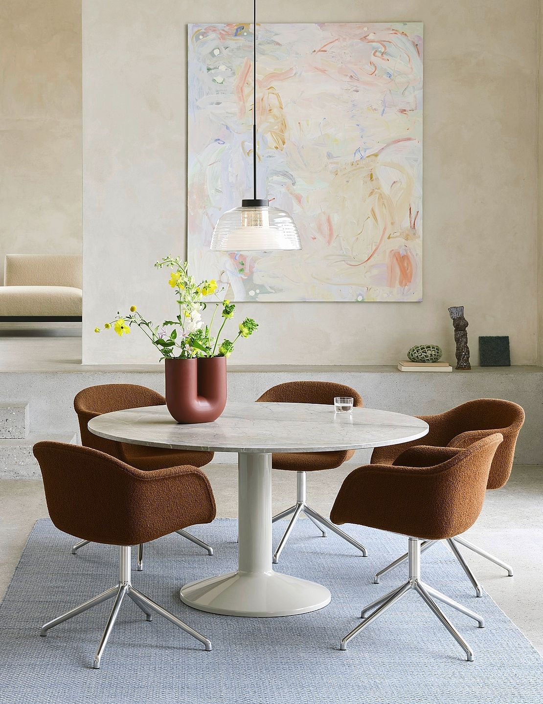Das edle Material inspiriert auch weiterhin Designer und Hersteller, wie an den diesjährigen Designmessen wie dem Salone del Mobile in Mailand zu sehen war. Besonders bei der Gestaltung von Tischen hat sich Marmor durchgesetzt – und das aus gutem Grund. Der Stein vereint Ästhetik und Funktionalität auf besondere Weise: Seine kühle, glatte Oberfläche wirkt edel und modern, zugleich strahlt sie eine natürliche Ruhe aus. Kein Stück gleicht dem anderen – jede Marmorplatte wird durch ihre individuelle Maserung zum Unikat. In einer Zeit, in der Beständigkeit und Echtheit wieder an Bedeutung gewinnen, bietet der Stein genau das, wonach viele suchen: Substanz. Das schwedische Designstudio TAF Studio entwarf für Muuto mit «Midst» (1) einen grosszügigen Tisch in schlichter Silhouette. Auf einem monolithischen Fuss aus hochglänzendem Stahl liegt eine geschliffene Tischplatte aus grauem Marmor. Das Grau des Steins, die exquisite Maserung und die subtilen blauen Untertöne verleihen dem Entwurf eine raffinierte Note. Der Sockel ist in Grau, Schwarz oder Dunkelrot erhältlich.