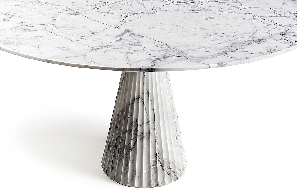 In klassischem Weiss oder Schwarz zeigt sich die Tisch-Familie «Odette» (6) beim Hersteller Lithos Design: Die tiefschwarze Oberfläche aus Nero-Marquina-Marmor hebt dabei die besondere Form hervor und betont das Zusammenspiel von Rundungen, Balance und Lichtreflexen, während die weisse Version in Arabescato-Vagli-Marmor eine nahezu theatralische Eleganz in den Raum bringt. Die deutsche Marmor-Manufaktur Draenert lancierte den Esstisch «Kent» (7) in neuer Trapeza-Form. Sie verleiht dem markanten Entwurf eine zusätzliche Dimension: Runde Elemente verbinden sich mit quadratischen. Die beiden Aluminiumguss-Halbschalen des Unterbaus garantieren eine hohe Standfestigkeit sowie viel Beinfreiheit. Je nach Wahl der Tischplatte unterstreicht die geschwungene Struktur der Natursteinmaserung die Dynamik des Designs. Elegant ist die Variante in haselnussfarbenem Breccia-Sarda-Marmor.