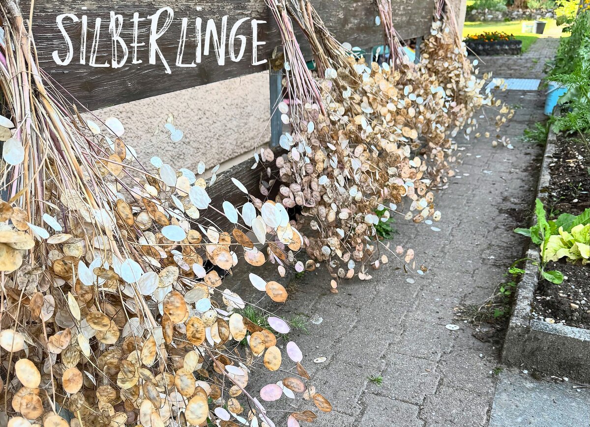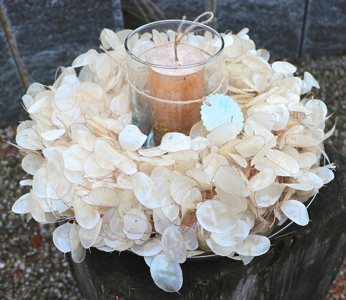 Der edle, silbrig-weisse Kranz besteht aus dem einjährigen Silberblatt (Lunaria annua) und ist auch für Einsteiger einfach zu binden. Einmal fertiggestellt, hält der Kranz mehrere Jahre und verliert auch seine Farbe nicht. Silberlinge kann man selber im Garten ansäen. Dafür die Samen, die in Gärtnereien erhältlich sind, im Frühling direkt im Garten aussäen. Im ersten Jahr wächst nur das Blatt. Im zweiten Jahr blüht der Silberling im Frühling violett. Anschliessend bilden sich die Samenstände aus. Diese trocknen über den Sommer ein und verschönern im Herbst den Garten. Wenn man nicht alle Silberlinge erntet, vermehren sie sich selbstständig und man hat jedes Jahr neue Silberlinge für viele schöne Dekoideen.