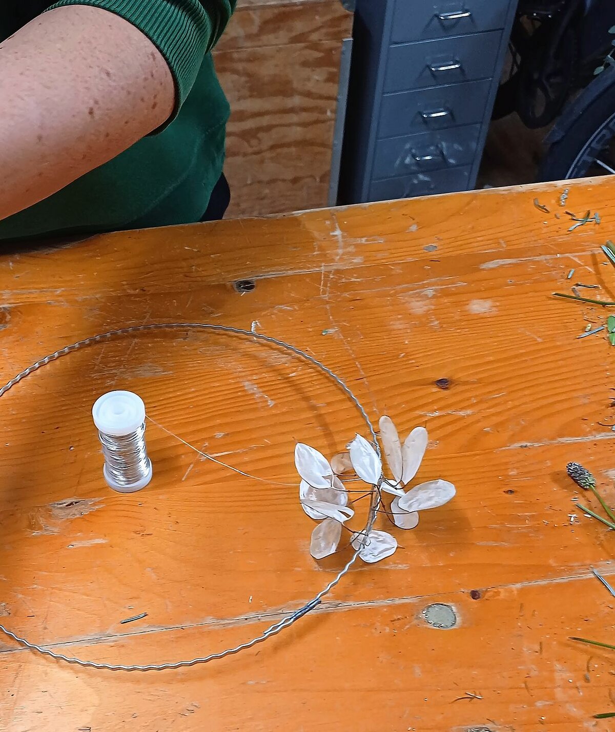 2 Die getrockneten weissen Samenstände in kleine Portionen schneiden und diese mit einem feinen Draht an einen Metallring binden (zwei Umdrehungen reichen). Anschliessend jeweils über der Bindestelle eine neue Portion Samenstände legen und wiederum binden. Diesen Schritt so lange wiederholen, bis der Kranz rundum umwickelt ist.