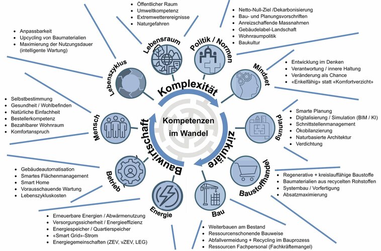 Um die Ziele des nachhaltigen, zirkulären Bauens in der Praxis zu verankern, sind entsprechende interdisziplinäre Kompetenzen über alle Planungs- und Bauphasen hinweg erforderlich, die es erlauben, komplexe Systeme aus der Bau- und Energietechnik ganzheitlich zu verstehen. Gebäude werden heute mehr denn je als komplexes Zusammenspiel von Funktion, Material, Konstruktion und Energie verstanden. Dies bedarf eines vertieften Verständnisses für energietechnische Zusammenhänge sowie deren Aus- und Bewertung. Es entstehen dadurch, auch im Hinblick auf den zunehmenden Einsatz künstlicher Intelligenz im Planungsprozess, neue Aufgabengebiete, die selbst für Generalisten wie Architekten aufgrund der vielen relevanten Schnittstellen Planungsaufgaben noch komplexer machen. Die nötige interdisziplinäre Zusammenarbeit wird je länger je mehr spezialisierte «Schnittstellenmanager» benötigen. Was für Baufachleute bereits eine grosse Herausforderung ist, wird für private Bauherrschaften und künftige Hauseigentümer immer mehr zur Herkulesaufgabe.