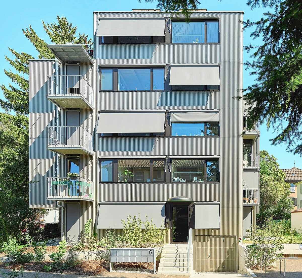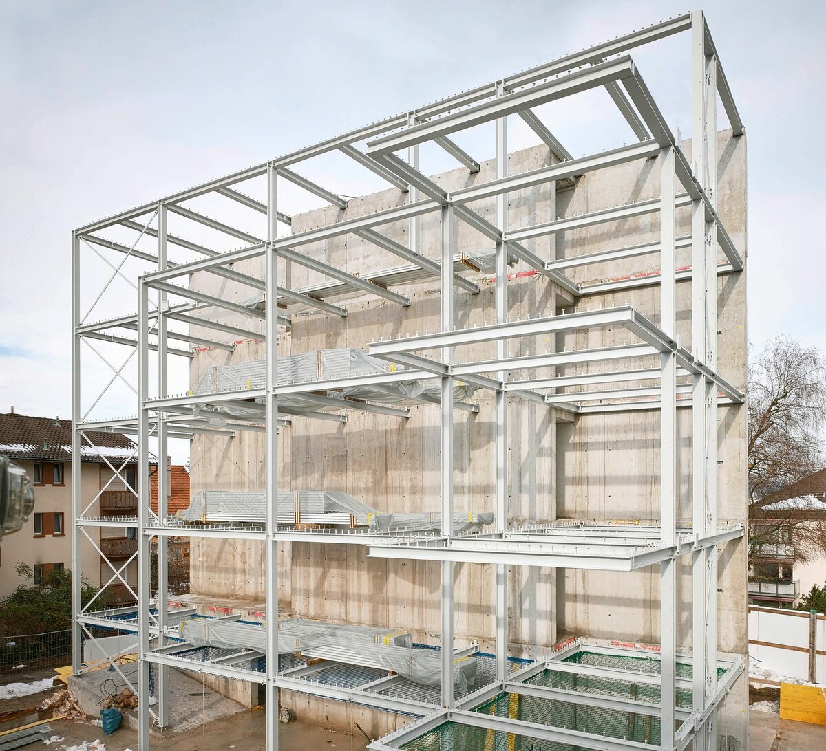 Was bei Gewerbebauten und Freizeitanlagen gang und gäbe ist, fristet im Wohnungsbau bis heute ein Schattendasein: Die Stahlbauweise ist in der Schweiz im Gegensatz zu anderen europäischen Ländern im Wohnungsbau nicht sehr verbreitet. Ein Mehrfamilienhaus in Zürich-Oerlikon zeigt, dass die Hybridbauweise mit Stahl, Aluminium, Beton und Holz bezüglich Kosten, Ästhetik, Dauerhaftigkeit und Wohnlichkeit auch im Wohnungsbau neue Massstäbe setzt – und zugleich einen wesentlichen Beitrag zur Schonung von Ressourcen und Förderung der Kreislaufwirtschaft im Bauwesen leisten kann. Dabei waren hinsichtlich der Platzverhältnisse, der Parzellenausnutzung und der Nutzungswünsche der beiden benachbarten Parzellenbesitzer Anforderungen zu erfüllen, die alles andere als alltäglich waren.