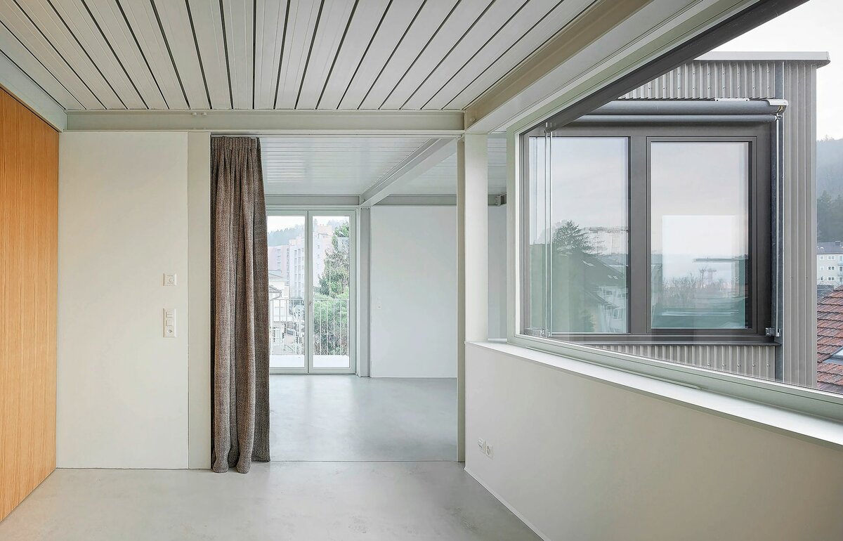 Die längsseitige Brandmauer und der Stahlbetonkern dienen als Rückgrat in der Erschliessungszone des Gebäudes. Davon ausgehend greift das Stahlbauskelett das Bauwerk nach Norden und Süden aus und bildet so zwei Haushälften, deren Wohnräume gänzlich ohne tragende Wände auskommen. Die Zwischenwände bestehen aus Holzrahmen, die Raumtrennung erfolgt mittels Schiebetüren oder Vorhängen. Einfachheit und Flexibilität sind die zentralen Wohnqualitäten, die sich aus dem Baukonzept ergeben.