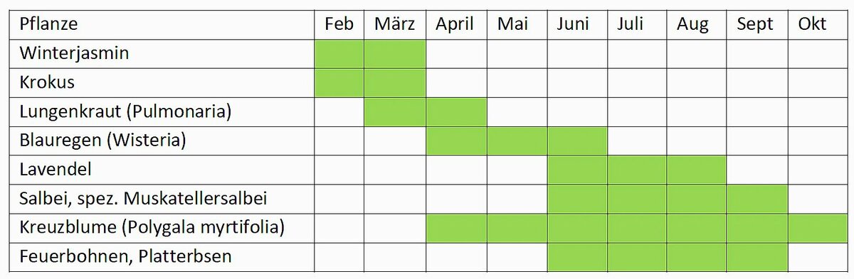 Wer Holzbienen dauerhaft in seinem Garten haben will, sollte neben altem Holz auch auf ein möglichst permanentes Angebot an geeigneten Blüten in seinem Garten achten. Die Pflanzenvorschläge der obigen Grafik stellen ein durchgehendes Blütenangebot, Bienenfreunde nennen es «Trachtfliessband», sicher. Die genannten Pflanzen gehören zu den beliebtesten Nektarquellen von Holzbienen.