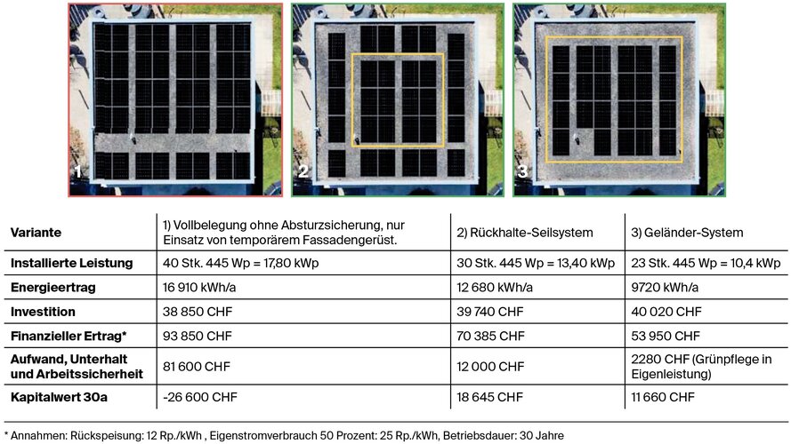 Photovoltaikanlagen müssen regelmässig kontrolliert und gepflegt werden, damit sie dauerhaft zuverlässig Strom liefern. Auf den Modulen kann sich Schmutz ansammeln, was die Leistung mindert. Besonders bei Anlagen auf Gründächern ist es wichtig, dass genug Platz zwischen den Modulen vorhanden ist, um die Gründächer zu pflegen und zu hohe Gräser und abgestorbene Pflanzen zu entfernen. So können Beschattungen auf den Modulen vermieden werden. Solardächer, bei denen schon in der Planung Wartungswege und ein fest installiertes Sicherungssystem für das Wartungspersonal vorgesehen sind, lassen sich deutlich einfacher betreiben. Techniker können sich sicher bewegen, Schäden schneller erkennen und Reparaturen effizient durchführen. Das verhindert mögliche Folgekosten und erhöht am Ende die Wirtschaftlichkeit der Anlage, auch wenn weniger Dachfläche mit Modulen belegt ist. Die Mitglieder der Technischen Kommission Solar | Energie von Gebäudehülle Schweiz – Markus Weissenberger und Urs Hanselmann – zeigen diesen Zusammenhang anhand von drei Varianten (siehe Box unten).
