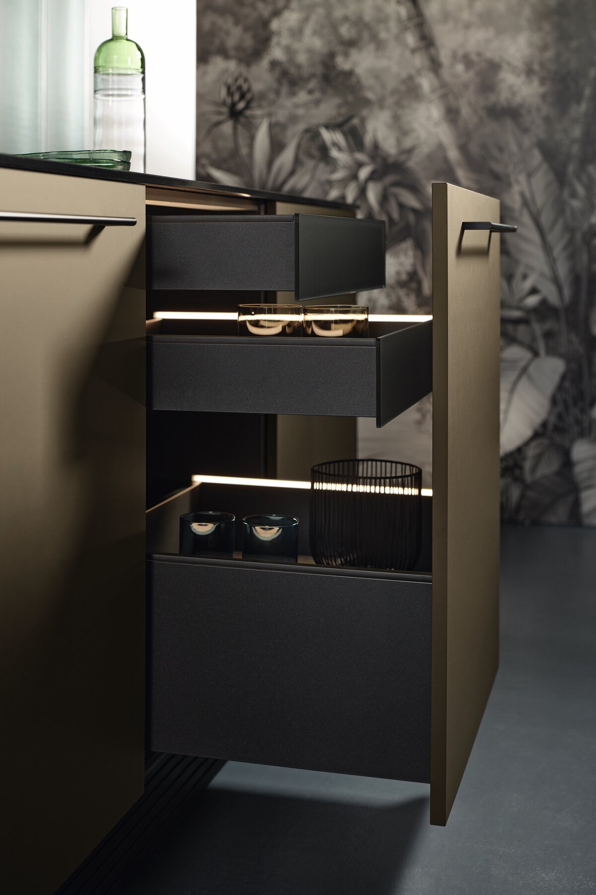 Mit nolteneo bietet Nolte Küchen ein Designupgrade. Diese Ausstattungslinie setzt auf aussergewöhnliche Materialien, exklusive Fronten und zahlreiche Individualisierungsmöglichkeiten. Zur Standardausstattung jeder nolteneo Küche gehört die neoBOX – ein Auszugs- und Schubkastensystem mit schmaler Seitenzarge in edlem Anthrazit. Die optionale Beleuchtung sorgt für gutes Licht in den Schubkästen und schafft zugleich ein stimmungsvolles Ambiente. Der Akku lässt sich zum Aufladen einfach herausnehmen.