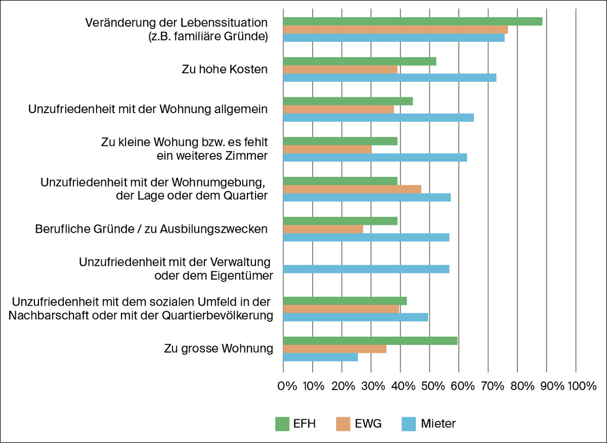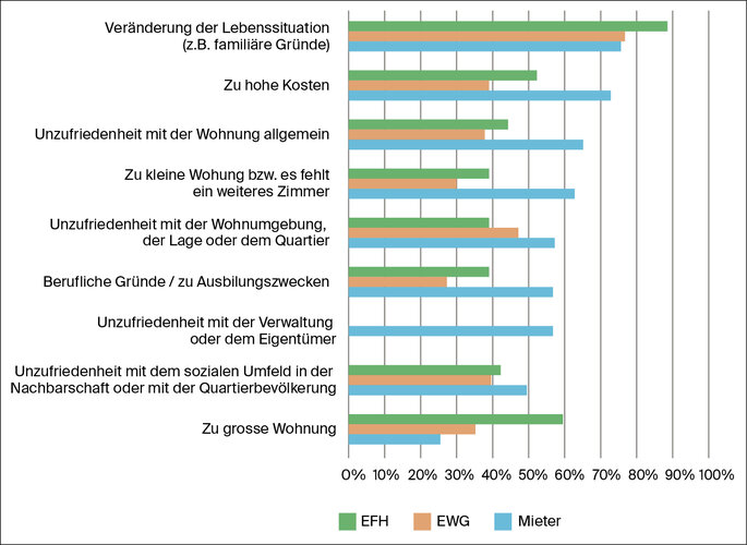Auch bei Eigentümern steht die veränderte Lebenssituation im Vordergrund – unabhängig davon, ob sie in einem Einfamilienhaus oder in einer Eigentumswohnung leben. Auffällig ist, dass die Kosten für Eigentümer deutlich seltener ein Umzugsgrund sind – ein Hinweis auf die gute finanzielle Planung von Eigentümern, begünstigt durch das tiefe Hypothekarzinsniveau der letzten Jahre. Häufig nennen Einfamilienhausbesitzer zudem ein «zu grosses Haus» als Grund für einen Umzug. Dies zeigt, dass Eigentümer ihre Wohnsituation durchaus an die jeweilige Lebensphase anpassen – etwa, wenn die Kinder ausziehen oder der Lebenspartner verstorben ist.