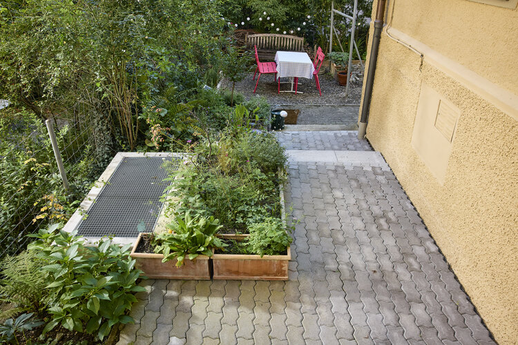 Doch die Ausblasöffnung war erst die halbe Miete. Ähnlich wie bei Zu- und Abluftsystemen müssen Ansaug- und Ausblasöffnungen von Wärmepumpen genügend Abstand zueinander aufweisen. Denn sonst würde bereits verwendete Luft ein zweites Mal angesaugt. Doch wo und wie konnte die Ansaugöffnung platziert werden? Frederik Brun prüfte verschiedene Varianten. Die Lösung war ein neuer Betonschacht. Er führt vom Technikraum unter dem Fussweg durch und mündet seitlich davon in einer Öffnung, die mit einem Gitterrost abgedeckt ist. Seit den Bauarbeiten im letzten Sommer sind die Pflanzen bereits kräftig gewachsen, und so nimmt man das Gitter kaum wahr. Dank dieser Lösung konnten sowohl die geschützte Fassade als auch der Aussenraum weitestgehend bewahrt werden.