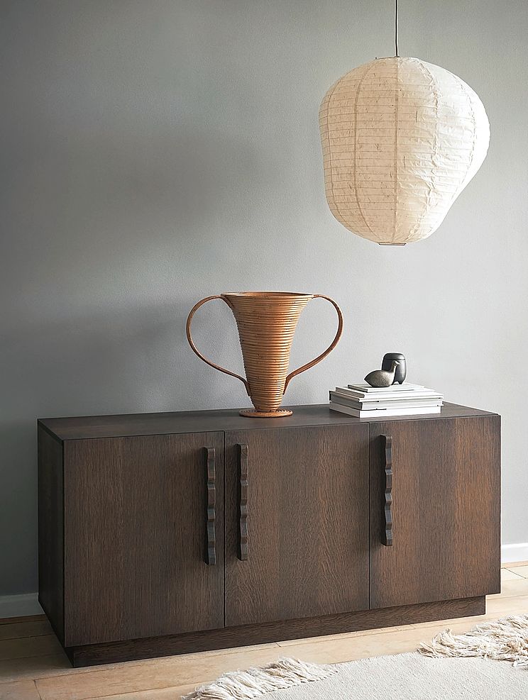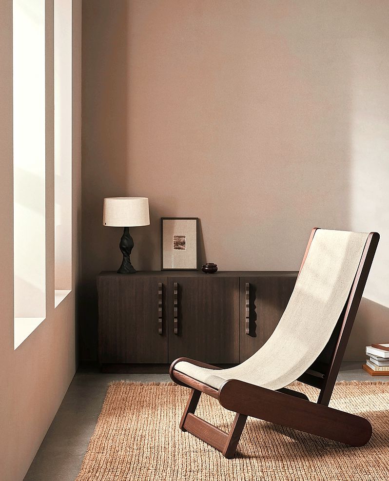 Das bedeutet nun nicht, dass man sich gleich völlig von der beigefarbenen Wohnung verabschieden muss. Bereits eine einfache Farbveränderung einzelner Möbel kann schon ausreichen, um eine ganz andere Optik zu erreichen. Ein grosses Sideboard aus dunklem Holz wie das Unda von Ferm Living kann als Blickfang dienen, während kleinere Objekte wie dunkle Salontische den Raum optisch zusammenhalten. Der Drop Leave von &Tradition schmeichelt jeder Sitzecke. Auch die Kommode Spindle von Ethnicraft bringt viel Eleganz ins Schlafzimmer.