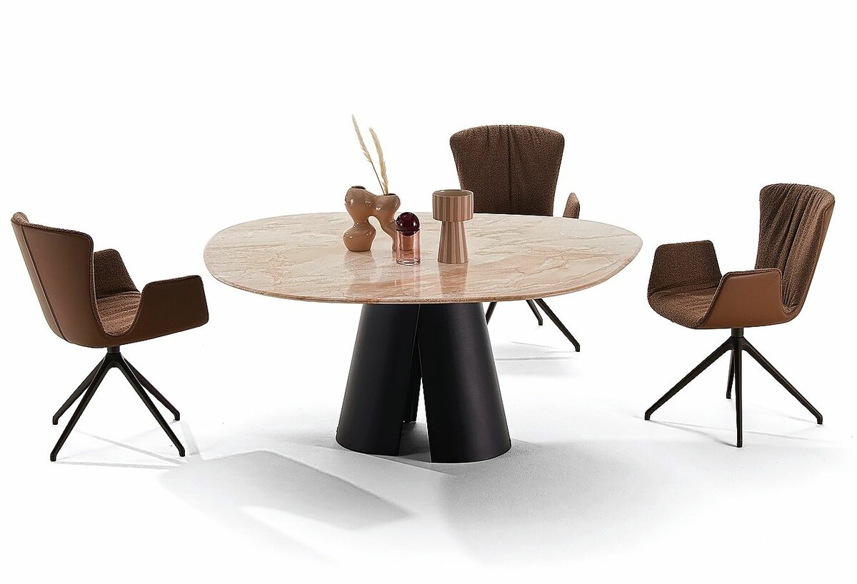 In klassischem Weiss oder Schwarz zeigt sich die Tisch-Familie «Odette» (6) beim Hersteller Lithos Design: Die tiefschwarze Oberfläche aus Nero-Marquina-Marmor hebt dabei die besondere Form hervor und betont das Zusammenspiel von Rundungen, Balance und Lichtreflexen, während die weisse Version in Arabescato-Vagli-Marmor eine nahezu theatralische Eleganz in den Raum bringt. Die deutsche Marmor-Manufaktur Draenert lancierte den Esstisch «Kent» (7) in neuer Trapeza-Form. Sie verleiht dem markanten Entwurf eine zusätzliche Dimension: Runde Elemente verbinden sich mit quadratischen. Die beiden Aluminiumguss-Halbschalen des Unterbaus garantieren eine hohe Standfestigkeit sowie viel Beinfreiheit. Je nach Wahl der Tischplatte unterstreicht die geschwungene Struktur der Natursteinmaserung die Dynamik des Designs. Elegant ist die Variante in haselnussfarbenem Breccia-Sarda-Marmor.