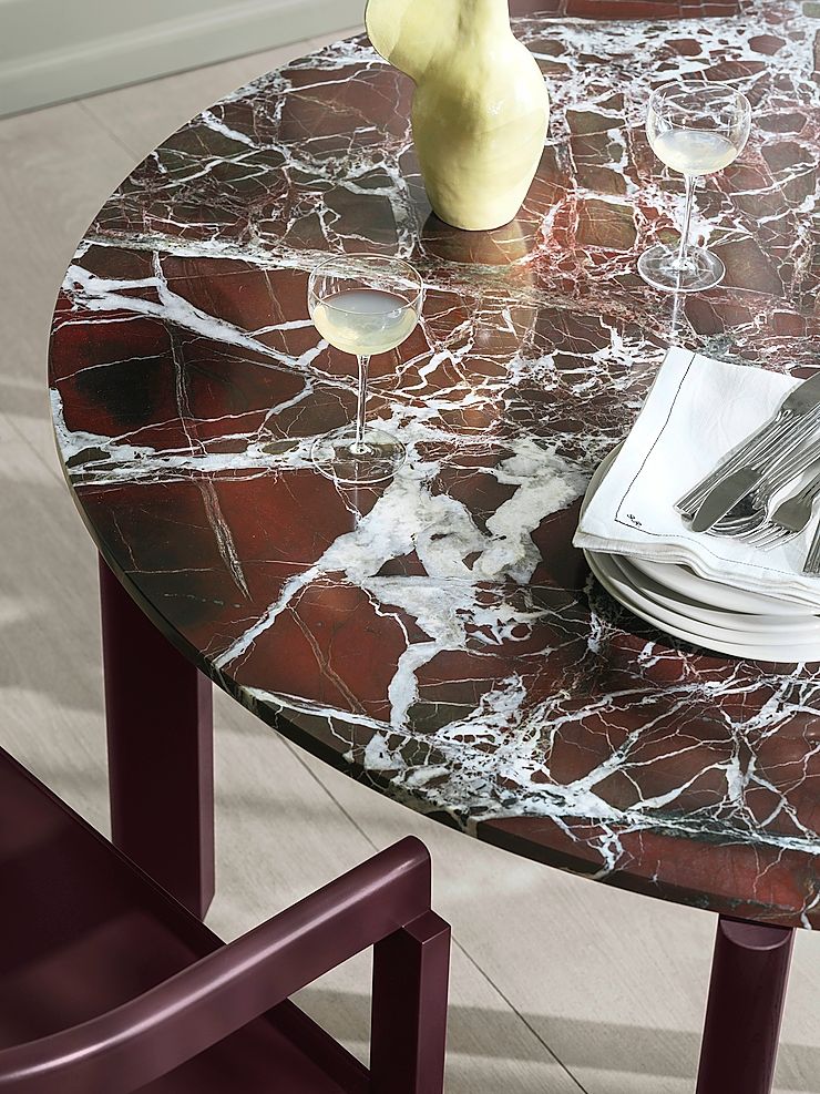 Sein Comeback feiert ein Marmor-Klassiker aus den 1970er-Jahren: Der italienische Altmeister Angelo Mangiarotti entwickelte damals mit «Eros» (9) eine Tischserie, die komplett aus Marmor gefertigt ist. Im radikalen Entwurfsansatz setzte Mangiarotti die Schwerkraft als zentrales konstruktives Element ein: Ohne Schrauben oder Verbindungselemente wird die Platte präzise in die Beine eingelassen und verbindet Stabilität mit formaler Eleganz. Gleichzeitig sind die sich ergebenden Verbindungen ein Gestaltungselement, aus denen sich die Form ableitet. Hersteller Agapecasa präsentiert die Neuauflage des Möbels in verschiedenen Ausführungen: ganz klassisch in weissem Carrara-Marmor, aber auch in rosa Portogallo-Marmor, dessen aussergewöhnliche Farbgebung für Möbel dieser Art selten ist. Rosa, Grün und Weinrot ergänzen dieses Jahr die Klassiker Weiss und Grau. Michael Anastassiades entwarf für den dänischen Hersteller Fritz Hansen die geometrisch-klare Serie «After» (3), die Stühle und Tische umfasst. Der in London lebende zypriotische Designer wählte dabei für die runde Tischplatte neben Esche Rosso-Levanto-Marmor – das kräftige Weinrot kontrastiert mit den hölzernen Beinen.