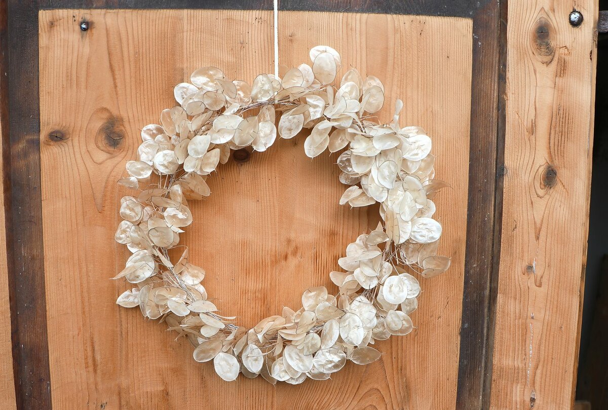 Der edle, silbrig-weisse Kranz besteht aus dem einjährigen Silberblatt (Lunaria annua) und ist auch für Einsteiger einfach zu binden. Einmal fertiggestellt, hält der Kranz mehrere Jahre und verliert auch seine Farbe nicht. Silberlinge kann man selber im Garten ansäen. Dafür die Samen, die in Gärtnereien erhältlich sind, im Frühling direkt im Garten aussäen. Im ersten Jahr wächst nur das Blatt. Im zweiten Jahr blüht der Silberling im Frühling violett. Anschliessend bilden sich die Samenstände aus. Diese trocknen über den Sommer ein und verschönern im Herbst den Garten. Wenn man nicht alle Silberlinge erntet, vermehren sie sich selbstständig und man hat jedes Jahr neue Silberlinge für viele schöne Dekoideen.