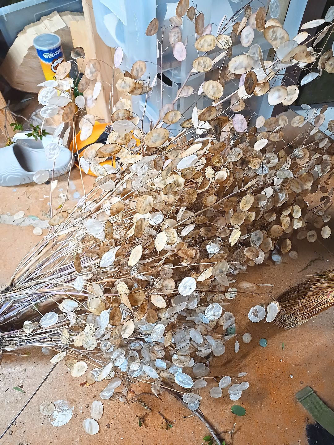 1 Im Herbst, wenn die Silberlinge durchgetrocknet sind, den ganzen Busch ernten. Anschliessend den Samenstand mit den Fingern von den braunen Blättern befreien, dann sind sie schön filigran weiss.