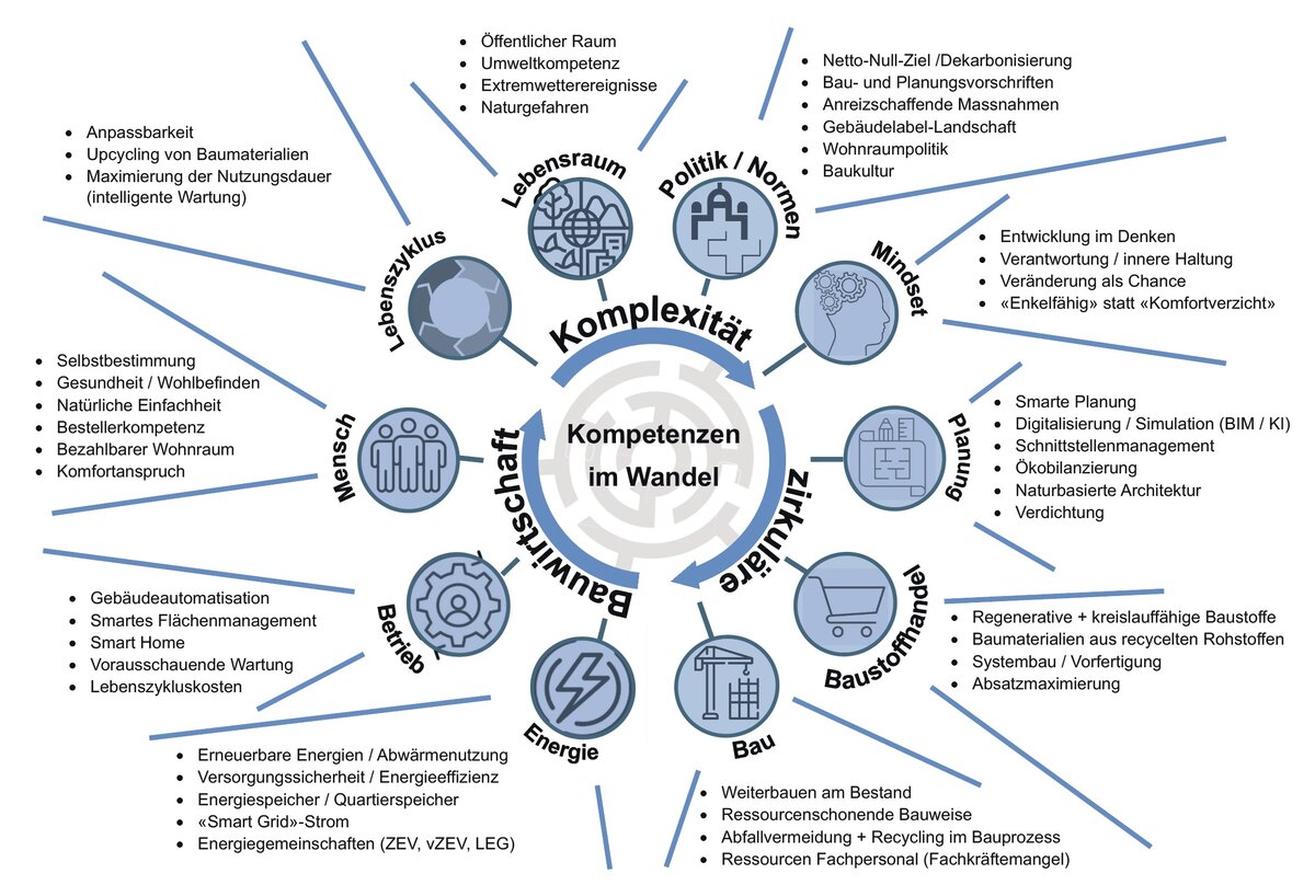 Um die Ziele des nachhaltigen, zirkulären Bauens in der Praxis zu verankern, sind entsprechende interdisziplinäre Kompetenzen über alle Planungs- und Bauphasen hinweg erforderlich, die es erlauben, komplexe Systeme aus der Bau- und Energietechnik ganzheitlich zu verstehen. Gebäude werden heute mehr denn je als komplexes Zusammenspiel von Funktion, Material, Konstruktion und Energie verstanden. Dies bedarf eines vertieften Verständnisses für energietechnische Zusammenhänge sowie deren Aus- und Bewertung. Es entstehen dadurch, auch im Hinblick auf den zunehmenden Einsatz künstlicher Intelligenz im Planungsprozess, neue Aufgabengebiete, die selbst für Generalisten wie Architekten aufgrund der vielen relevanten Schnittstellen Planungsaufgaben noch komplexer machen. Die nötige interdisziplinäre Zusammenarbeit wird je länger je mehr spezialisierte «Schnittstellenmanager» benötigen. Was für Baufachleute bereits eine grosse Herausforderung ist, wird für private Bauherrschaften und künftige Hauseigentümer immer mehr zur Herkulesaufgabe.