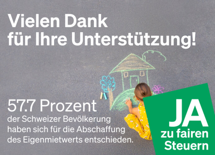 Das «Überparteiliche Komitee JA zur Abschaffung des Eigenmietwerts» und der HEV Schweiz sind hoch erfreut über das klare JA der Stimmbürgerinnen und Stimmbürger zum Bundesbeschluss über die kantonalen Liegenschaftssteuern auf selbstgenutzten Zweitliegenschaften. Damit wird die seit Jahrzehnten umstrittene Eigenmietwert-Steuer für selbstgenutztes Wohneigentum endgültig abgeschafft.