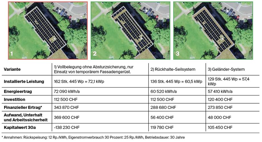 Photovoltaikanlagen müssen regelmässig kontrolliert und gepflegt werden, damit sie dauerhaft zuverlässig Strom liefern. Auf den Modulen kann sich Schmutz ansammeln, was die Leistung mindert. Besonders bei Anlagen auf Gründächern ist es wichtig, dass genug Platz zwischen den Modulen vorhanden ist, um die Gründächer zu pflegen und zu hohe Gräser und abgestorbene Pflanzen zu entfernen. So können Beschattungen auf den Modulen vermieden werden. Solardächer, bei denen schon in der Planung Wartungswege und ein fest installiertes Sicherungssystem für das Wartungspersonal vorgesehen sind, lassen sich deutlich einfacher betreiben. Techniker können sich sicher bewegen, Schäden schneller erkennen und Reparaturen effizient durchführen. Das verhindert mögliche Folgekosten und erhöht am Ende die Wirtschaftlichkeit der Anlage, auch wenn weniger Dachfläche mit Modulen belegt ist. Die Mitglieder der Technischen Kommission Solar | Energie von Gebäudehülle Schweiz – Markus Weissenberger und Urs Hanselmann – zeigen diesen Zusammenhang anhand von drei Varianten (siehe Box unten).