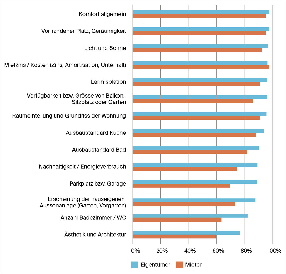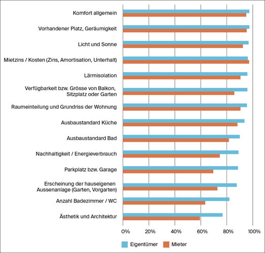 Mieter sind zudem eher bereit, auf einen Garten oder gemeinschaftliche Aussenflächen zu verzichten. Eigentümer hingegen verzichten häufiger auf die Nähe zum Arbeitsplatz oder auf einen allgemein hohen Ausbaustandard.