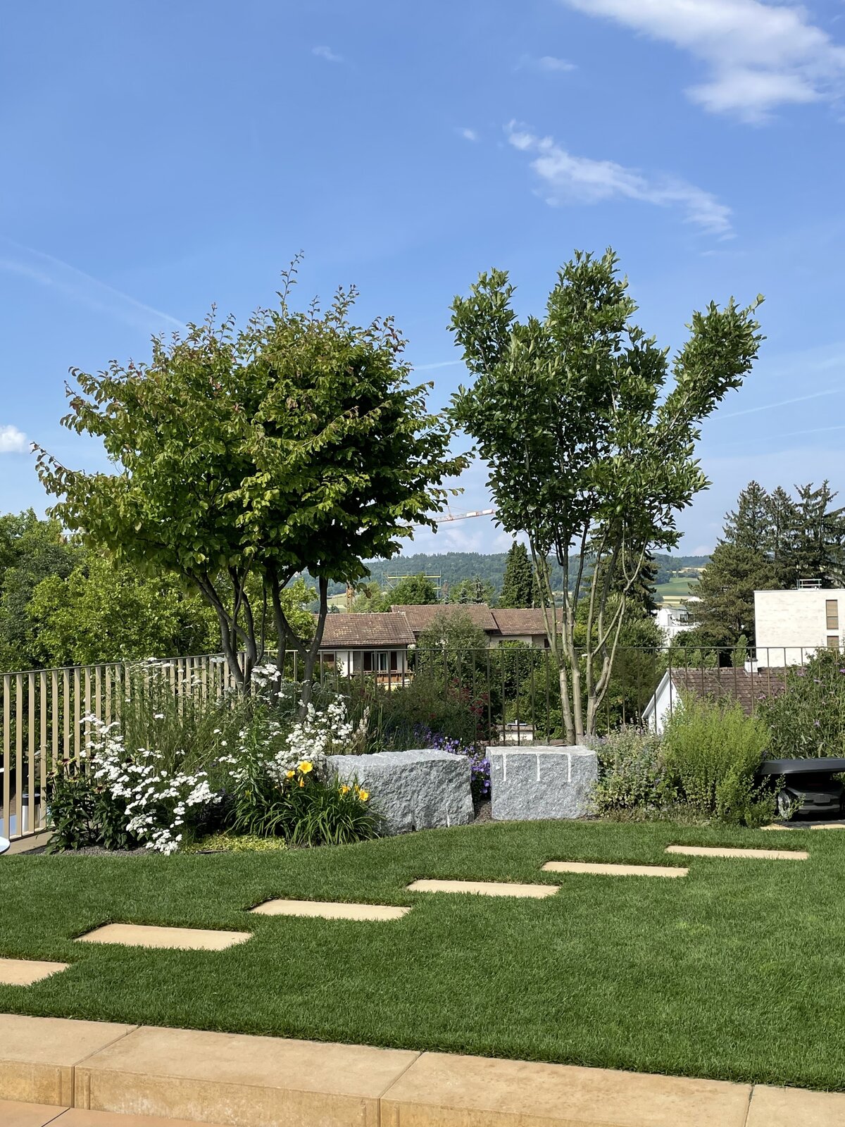 Die Pflanzenwahl fällt unter den gegebenen Umständen oft auf mediterrane Gewächse. Vor Jahren wurden diese Pflanzen für unsere Breitengrade noch nicht empfohlen. Diese Sichtweise hat sich aber inzwischen geändert: Grosse Rosmarinsträucher, Korkeichen oder gar Eukalyptus sind jetzt in den Gärten wie selbstverständlich anzutreffen. Viele dieser südländischen Pflanzen sind in unseren Breitengraden sogar ökologisch zuträglich, da beispielsweise Bienen und andere Insekten von ihnen profitieren. Dabei ist zu beachten, dass nicht jede neu eingeführte Pflanzenart invasiv ist. Als invasiv gelten Pflanzenarten, die sich in einem nicht heimischen Gebiet stark ausbreiten und dabei die einheimische Flora und Fauna sowie das Ökosystem beeinträchtigen. Das Wissen über solche Arten ist heute weit fortgeschritten, so dass potenziell problematische Pflanzen früh